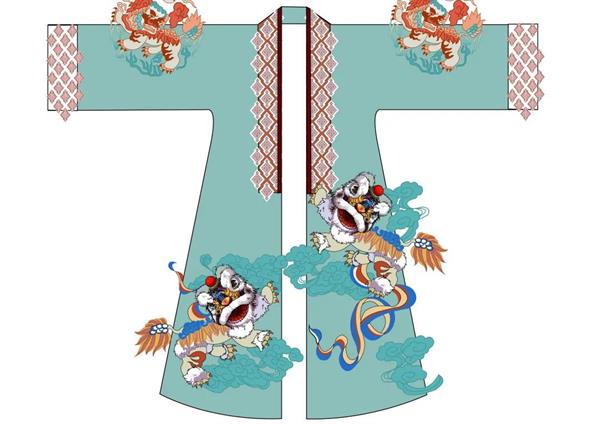汉服:艾色衫子黛蓝裙,儒雅如出发芙蓉,清丽可爱,袖间点暖,脚踩虹云,瑞狮戏绫,以动为静,寓吉祥之美意,继宋雅纹饰之传承。