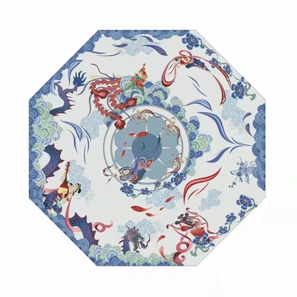 雨伞是人们日常生活中不可缺少的必备品,在雨伞上设计古典壁画图案不仅能为雨伞增加美观性,独特性,更具时尚感,也能展现古典壁画的魅力。将中西古典艺术与伞面结合,带入大众视野中,打破传统的艺术装饰感,源于生活却又高于生活。参照故宫的藻井,敦煌的飞天壁画,欧洲的穹顶,欧洲的壁画艺术等建筑典范,以图案的形式融入伞面。以雨伞为载体,更是想在阴雨或热日此类不良天气情况下撑伞时为心灵带来更多的慰藉。以相同“仰角”的视觉感受,来享受同等的视觉盛宴。