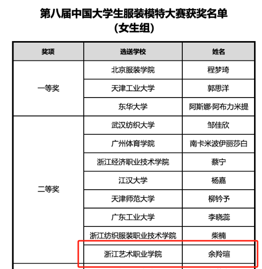 中国大学生服装模特大赛是国内唯一面向在校大学生服装表演专业的国家级模特赛事,是国内高等院校模特赛事的标杆。本次大赛共有来自全国82所本科院校、高职高专院校的105位选手同台竞技,现场通过平面拍摄技巧测试、专业素质测试和泳装、礼服、休闲服等环节展示,评选出一二三等奖和单项奖。余羚瑄现场发挥出色,台风稳健,充满自信,展示了浙艺风采。