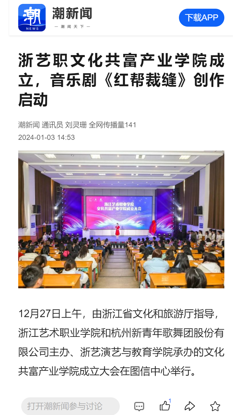潮新闻:浙艺职文化共富产业学院成立,音乐剧《红帮裁缝》创作启动