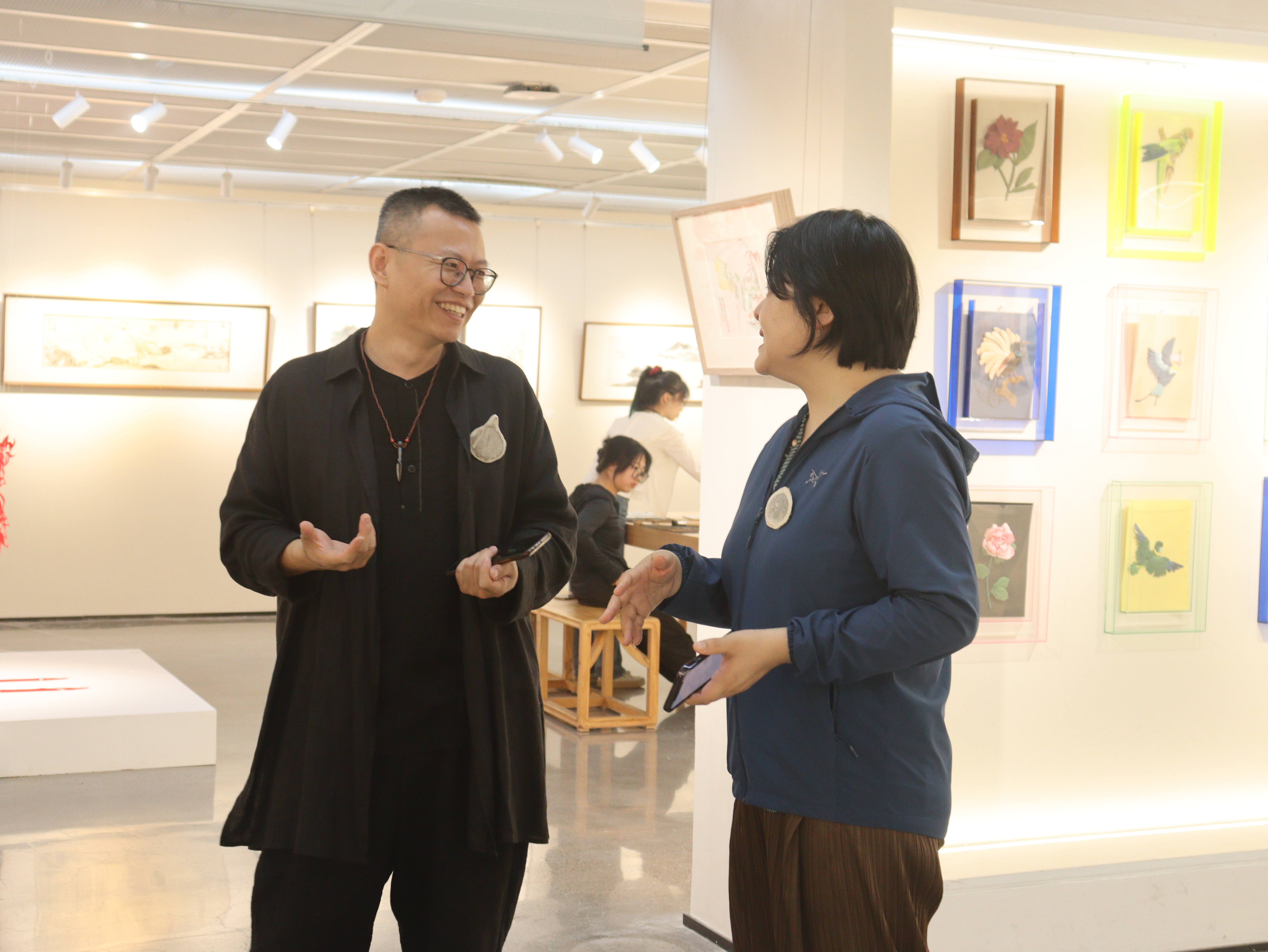 现场,在场嘉宾为本次“匠心守艺”非遗创意作品展剪彩。展览分为非遗创意产业学院共建企业邀请展、“纸间”艺术作品展和手工艺学院师生创作精品展三个部分。现场共展出龙泉刀剑作品、天铁瓷、刺绣、书画、剪纸、雕塑、水印木刻、综合材料等百余件展品。