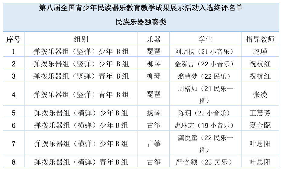 近日,文化和旅游部科技教育司公布第八届全国青少年民族器乐教育教学成果展示活动入选终评名单,我校共有9个项目入选,将于8月18日至23日赴南京参加现场展示暨终评,与全国各大音乐学院及艺术院校同台竞技。